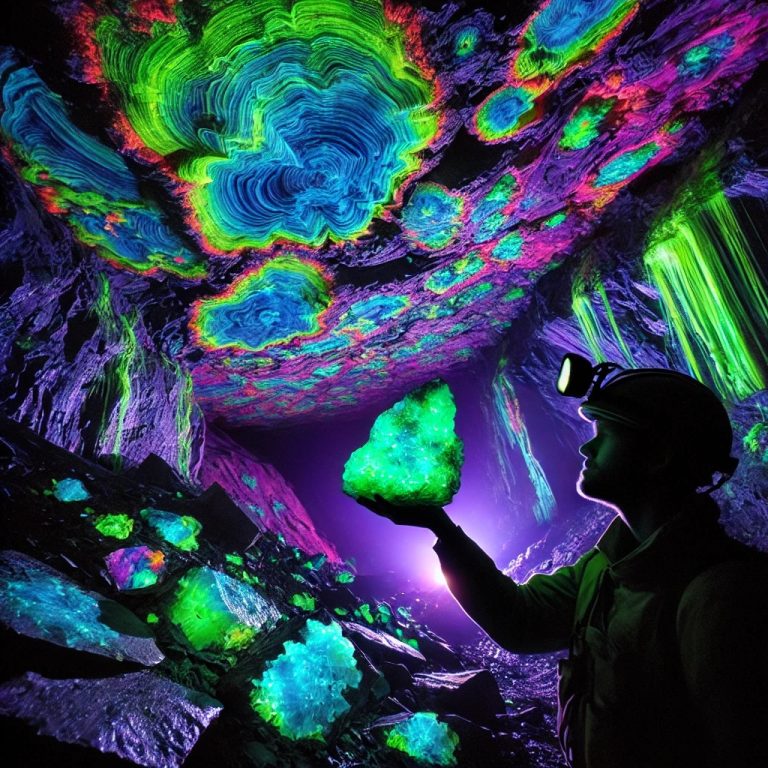 A glowing underground cavern at Franklin and Sterling Hill Mines with vibrant fluorescent minerals like willemite, clinohedrite, and hardystonite under UV light. The dark cavern walls contrast with the vivid green, blue, and violet glow, and a miner’s silhouette is seen holding up a gem in the foreground, evoking a sense of discovery.