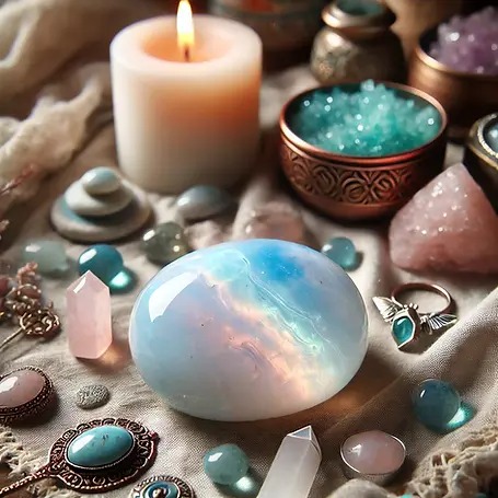 Opalite is believed to have powerful metaphysical properties, particularly in the areas of communication, emotional healing, and energy balance. The stone is often used in meditation and healing practices to enhance clarity of thought, reduce anxiety, and promote inner peace. Many people also use opalite to balance their chakras, particularly the throat chakra, which is associated with communication and self-expression.